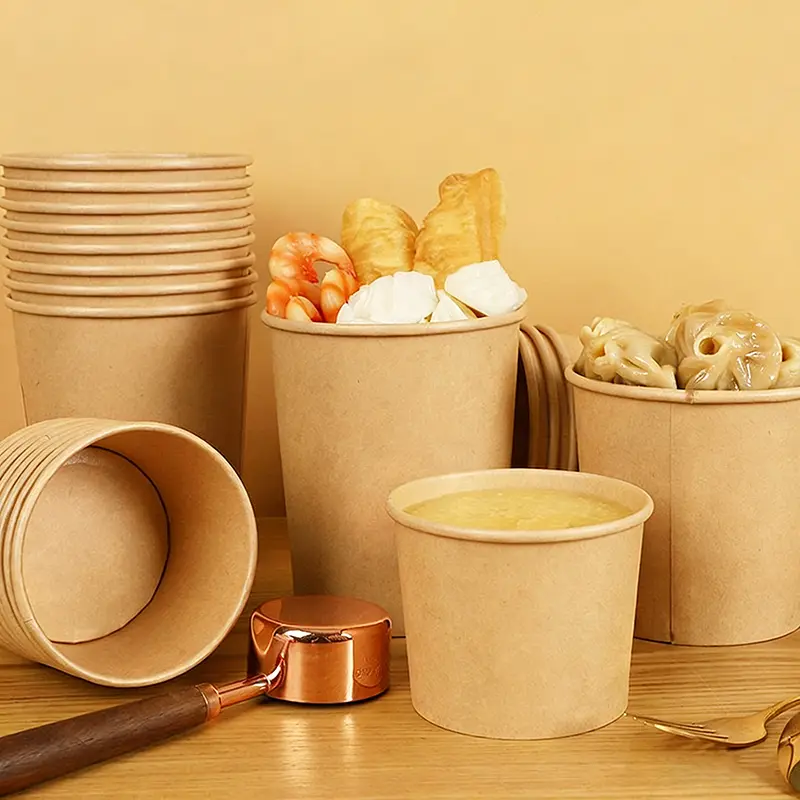 В нашей бумажной миске для супа из крафт-бумаги емкостью 32 унции можно безопасно хранить горячие супы, лапшу, макароны, рисовые тарелки, перец чили, отвар и салаты. Большая вместимость 32 унции идеально подходит для порционных обедов, что делает их широко популярными в кафе, гастрономах, фургонах с едой, ресторанах и магазинах повседневного спроса.
